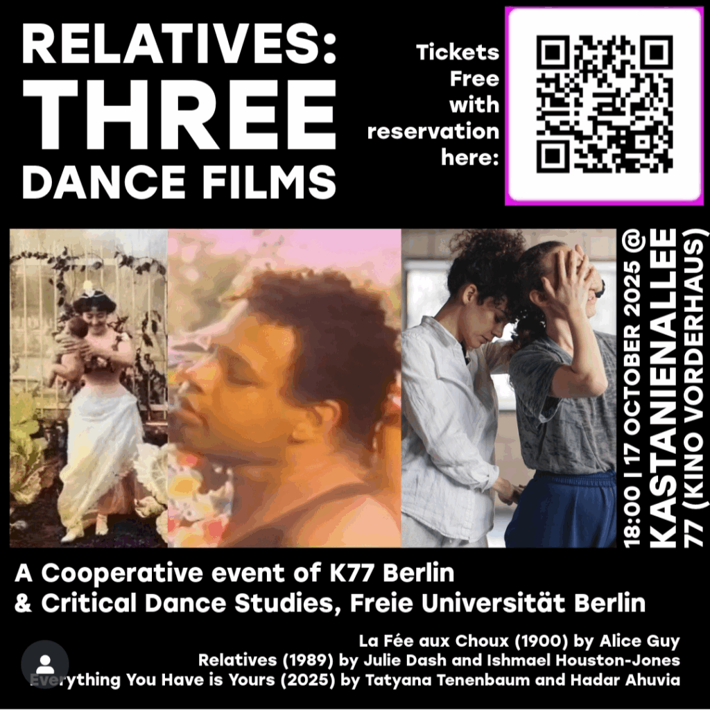 As a part of a troubling series of late nineteenth-century fantasy films on a baby-selling trade for the wealthy, pioneering filmmaker Alice Guy presents a dancing fairy plucking new lives from a cabbage patch in the bizarre early film La Fée aux Choux (1900). In Relatives (1989), directed by Julie Dash, improvisational dancer Ishmael Houston-Jones carries his complaining mother Pauline into a space of performance that he will share with her. He explores the family photo as a well of lost time and life stories from which he must nonetheless account for his own existence. Shown for the first time in Berlin, Tatyana Tenenbaum’s Everything You Have is Yours (2025) centers on the artistic research of dancer Hadar Ahuvia, who grew up learning folk dances practiced in the Jezreel Valley/Marj Ibn Amer, and who now rethinks what it means to be accountable to one’s heritage and history. In the film, a web of artistic portraits emerges— Jewish, Israeli, and Palestinian dancers living in New York City grappling with the questions of what we inherit and what we embody to carry forward.
